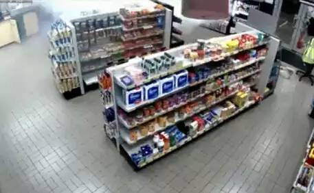 監(jiān)控錄像記錄了事發(fā)的整個過程:一開始,兩個帶著作案工具的蒙面盜賊在用力敲擊加油站內商店的玻璃門,動作十分兇狠。就在他們將要從被砸破的門洞中鉆進室內時,商店的一角開始噴發(fā)白色煙霧(仔細看下圖左上角)。